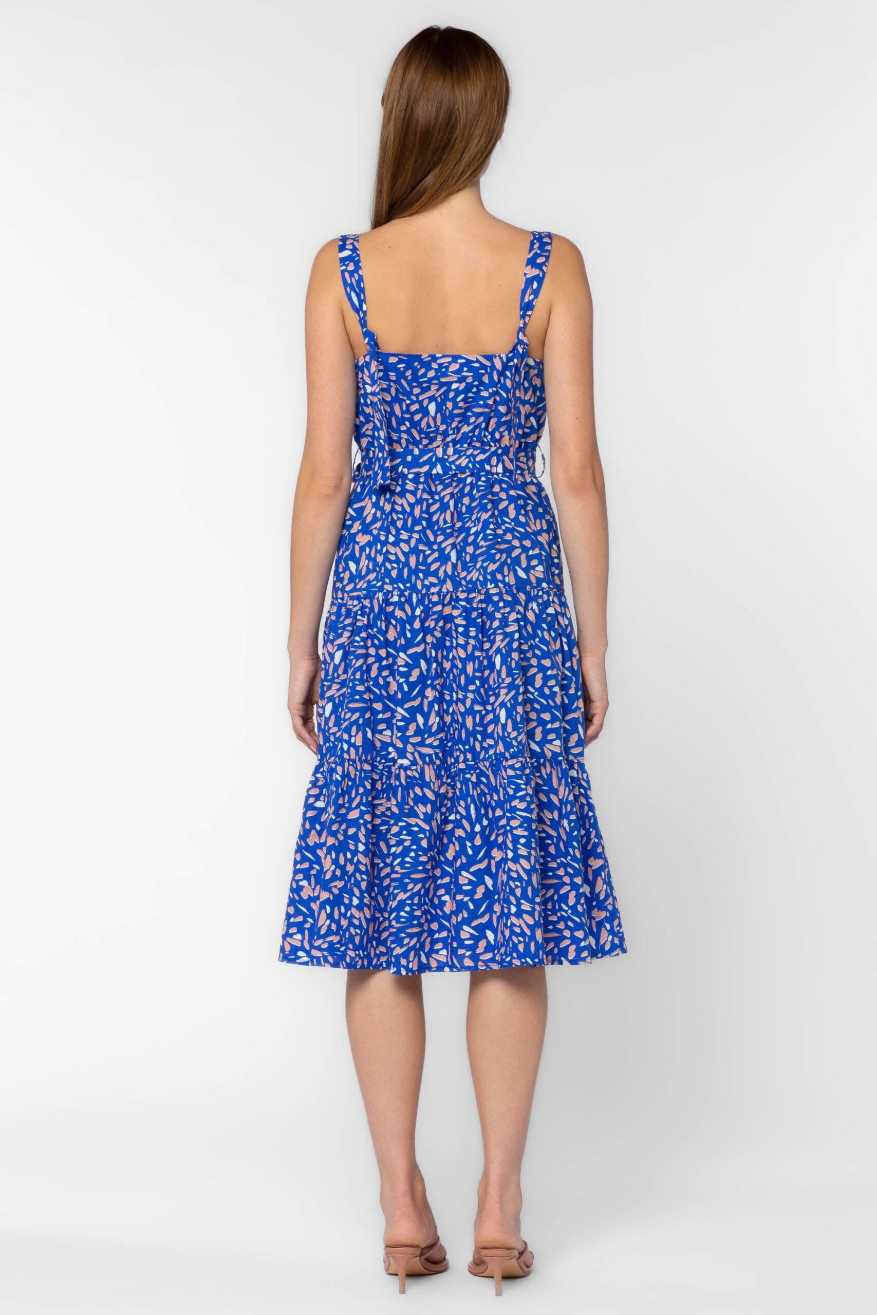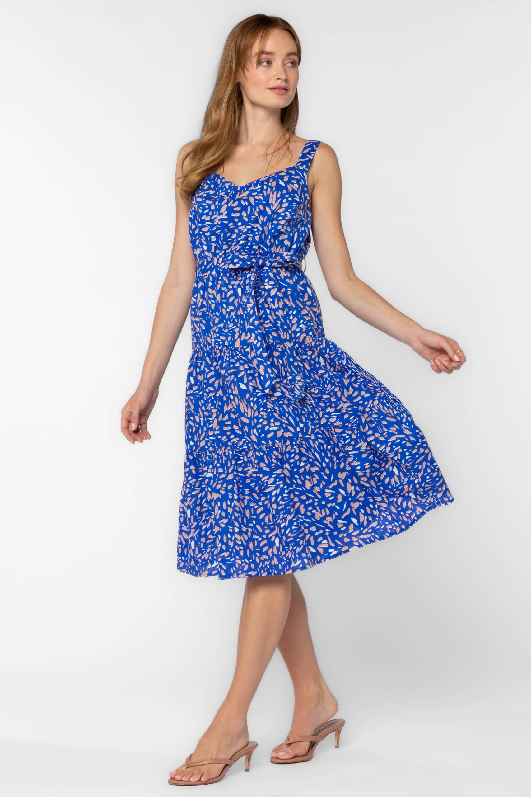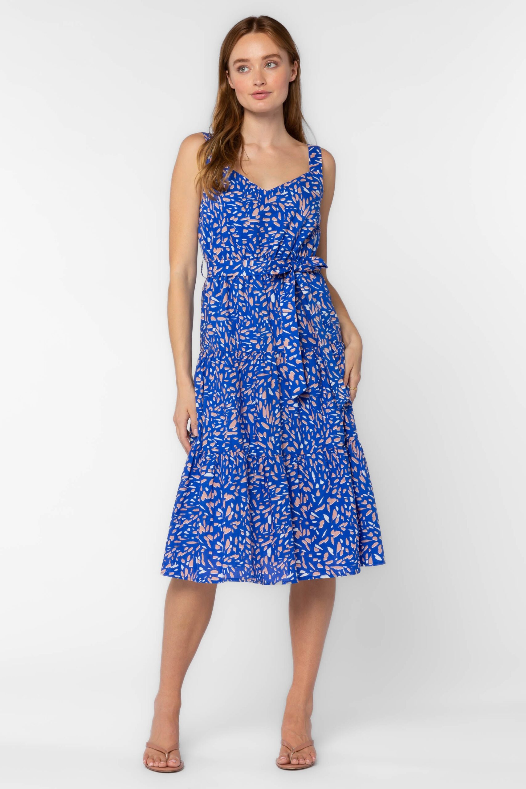 The tiered midi length dress has a flattering v-neckline and a self-belt. Back tied shoulder straps are adjustable.??