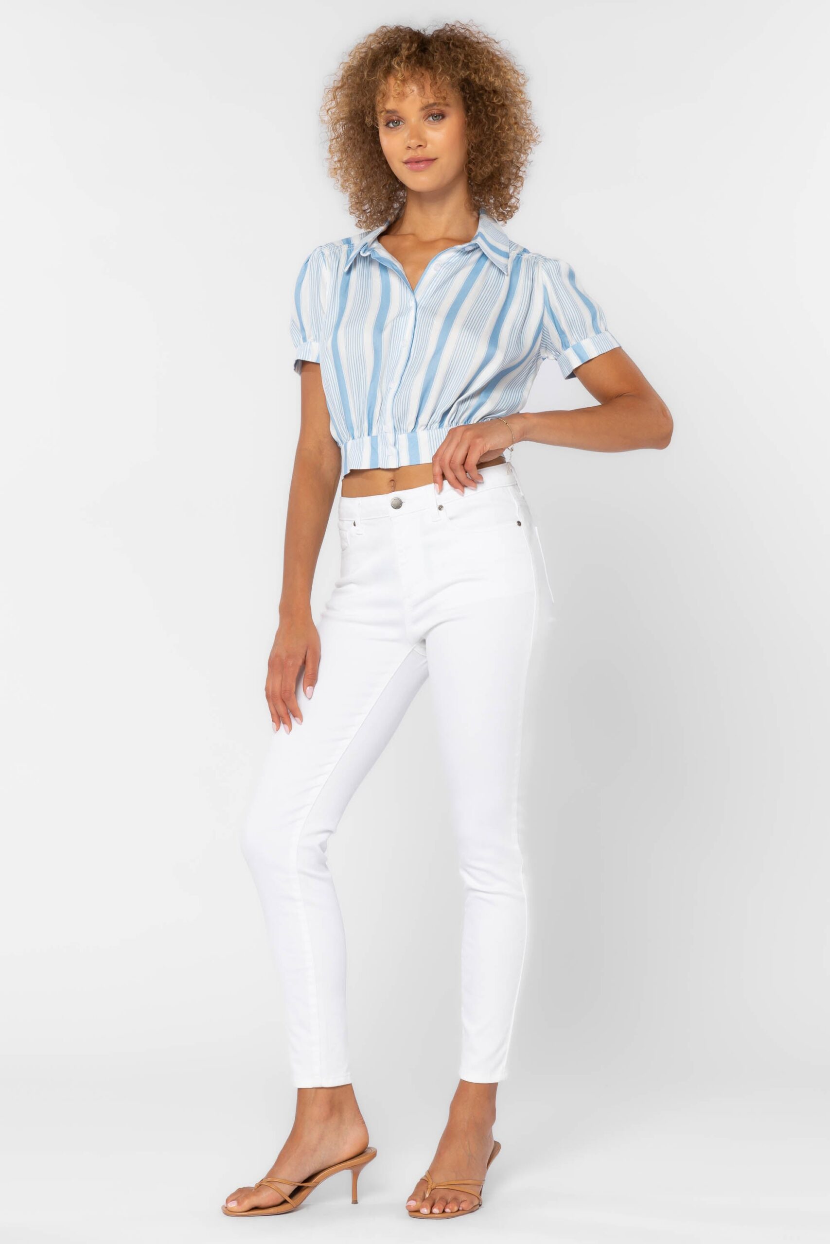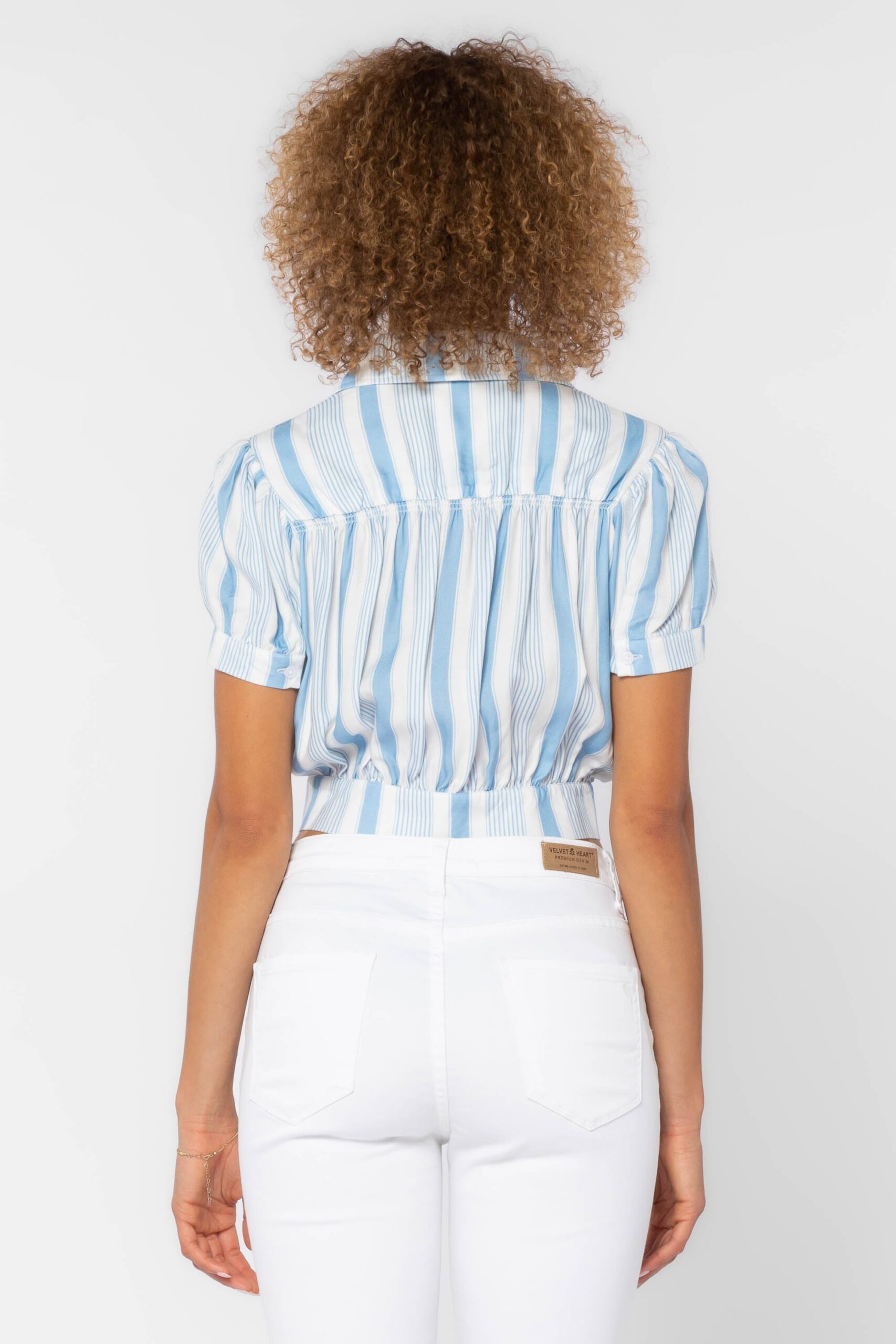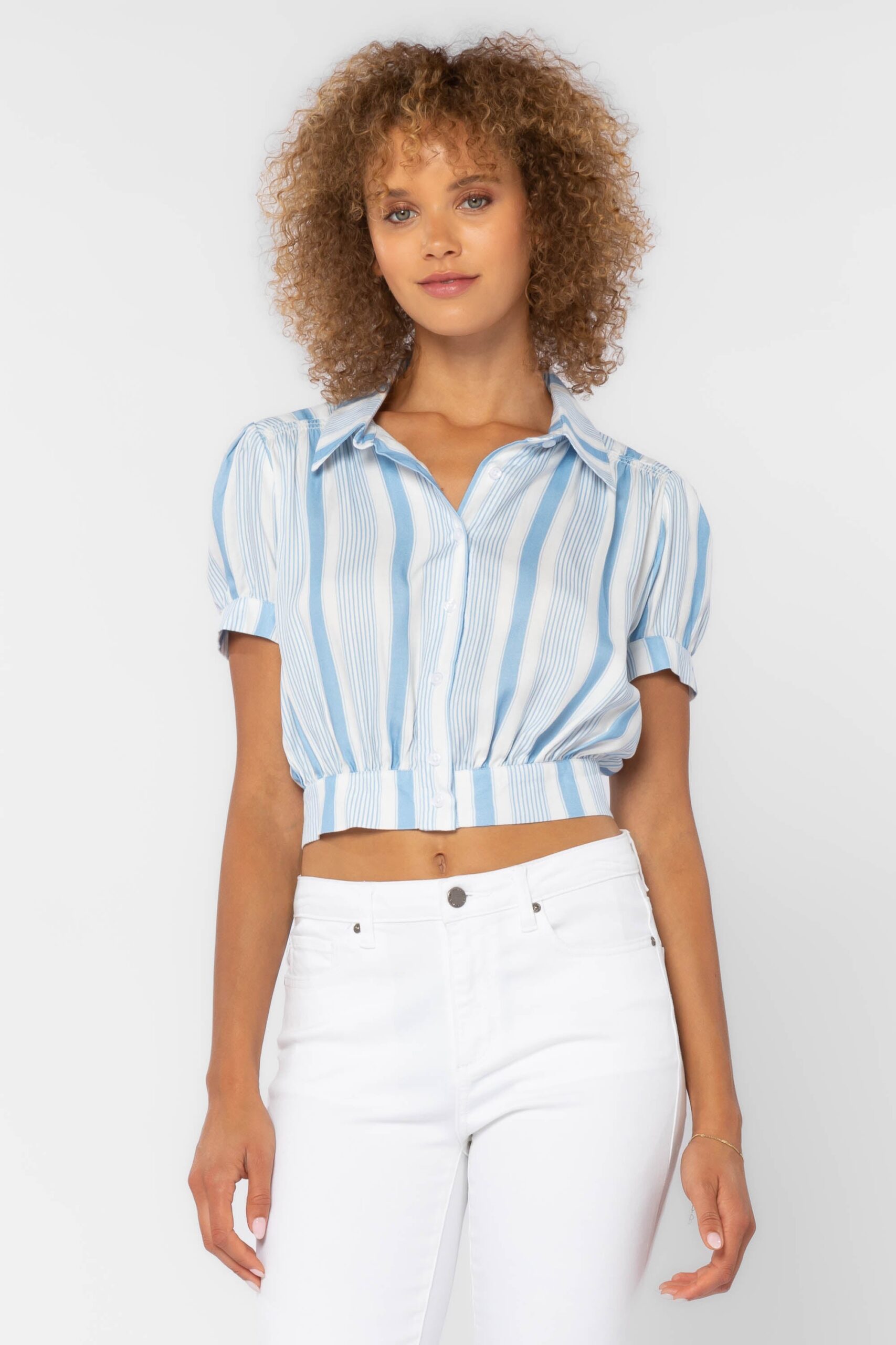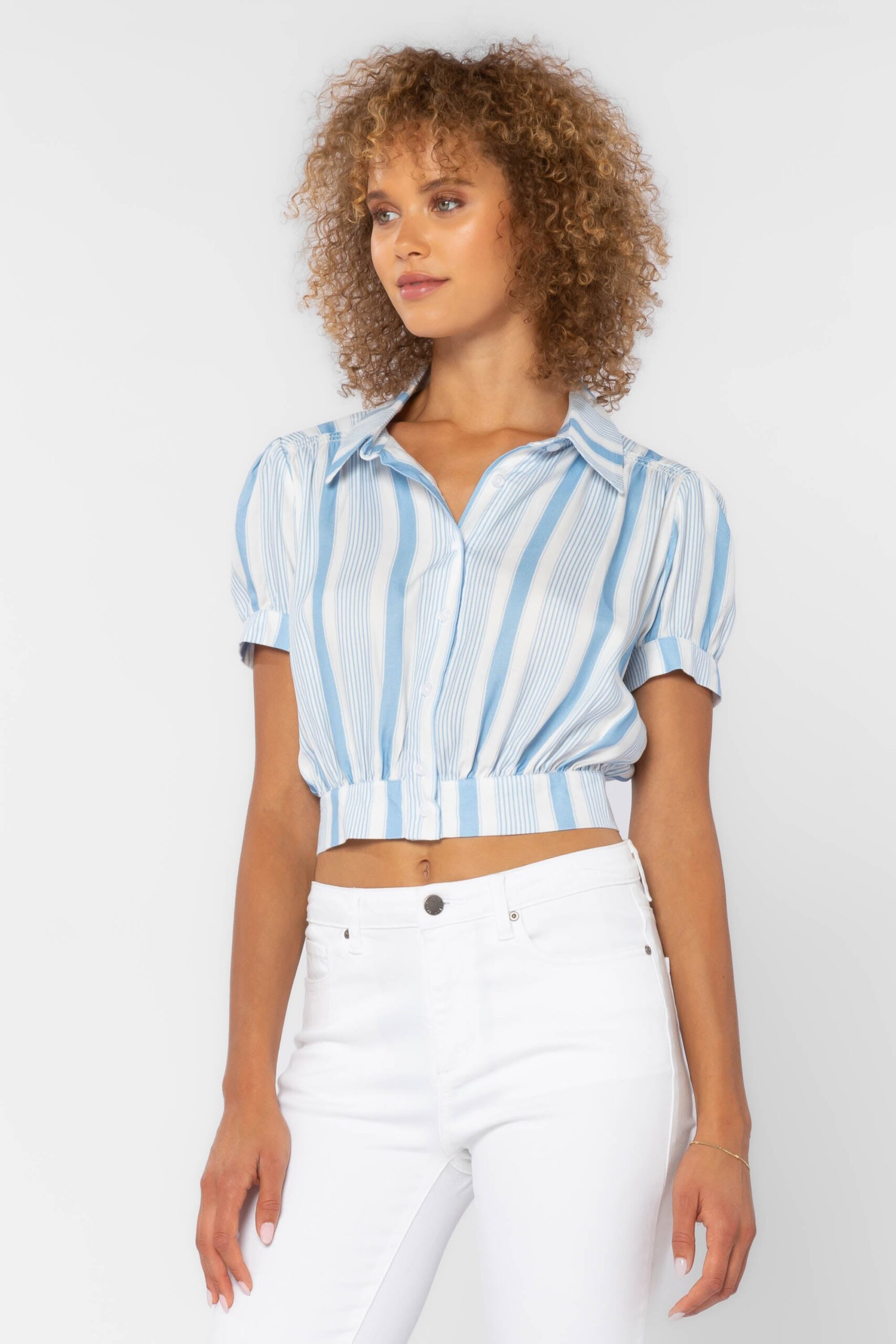 The cropped, midriff baring Shirt features a button-down front complete with a banded waist and slightly ffed short sleeves and gathered back yoke. Pair with jeans or with our matching Irene Tiered Skirt.