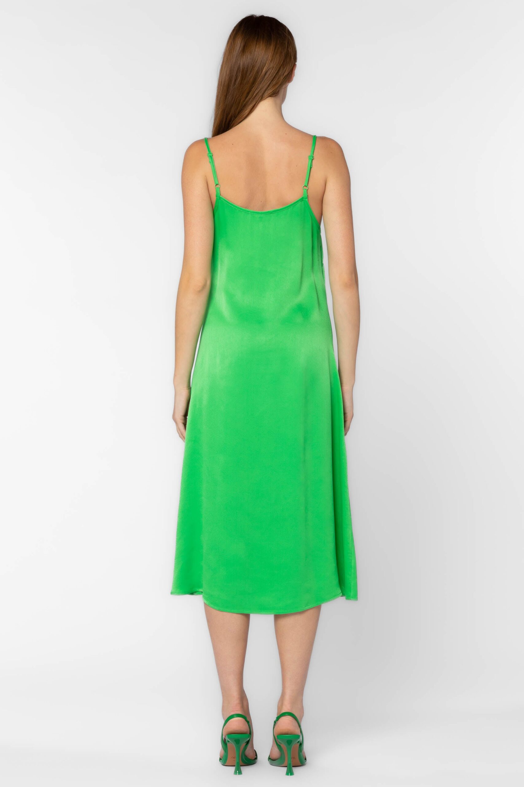 This midi slip dress with a v-neckline has adjustable shoulder straps and drapes and feels like satin.