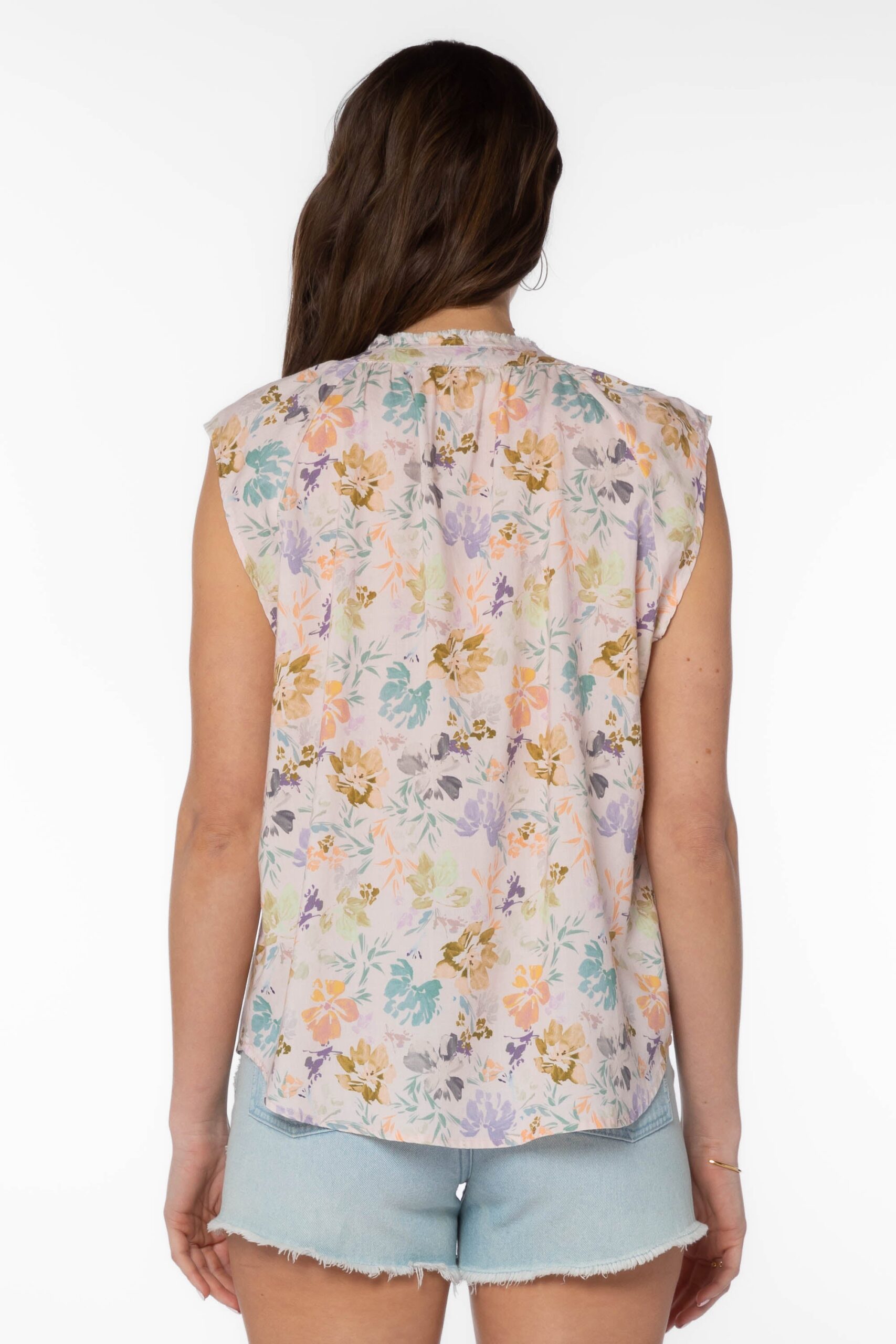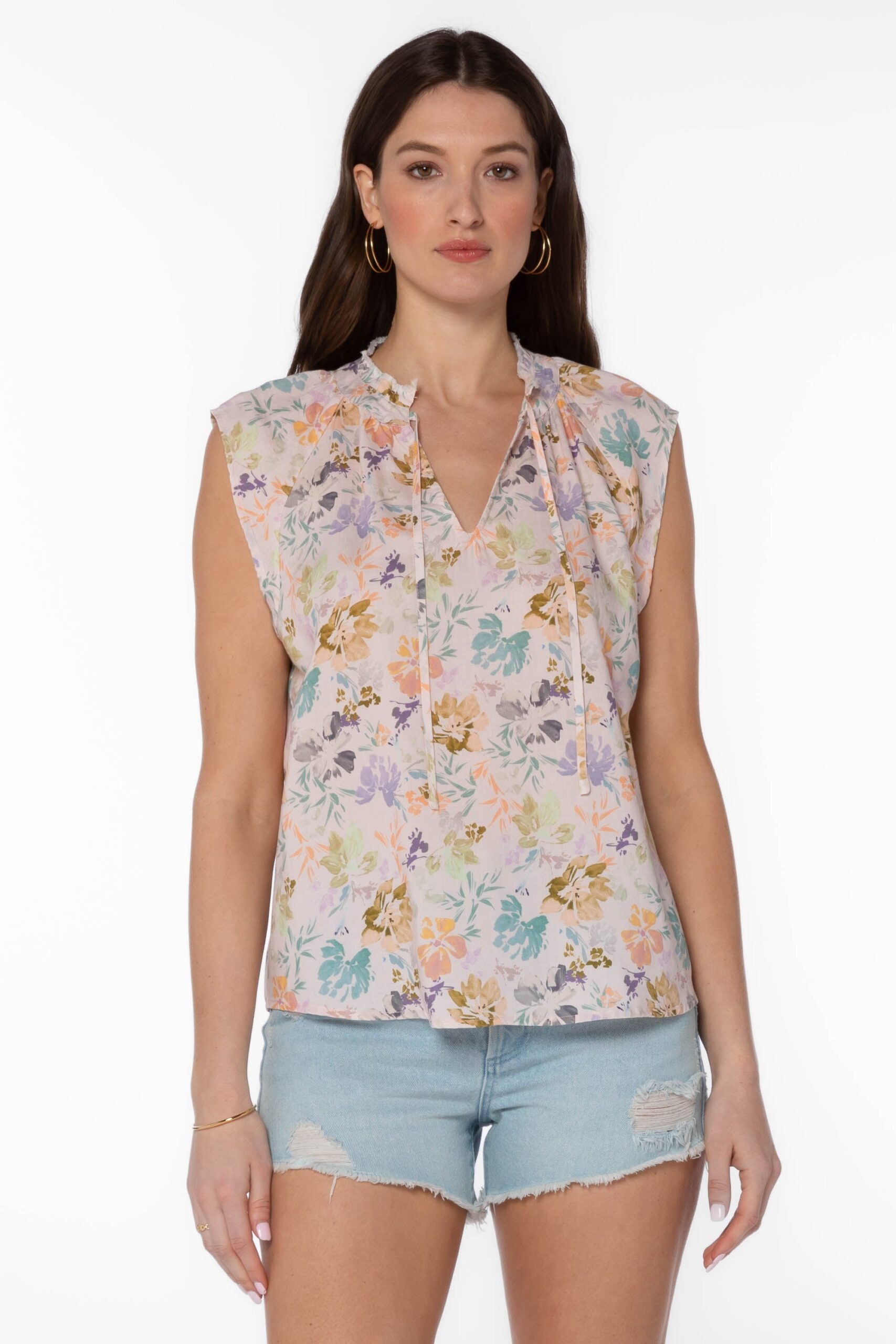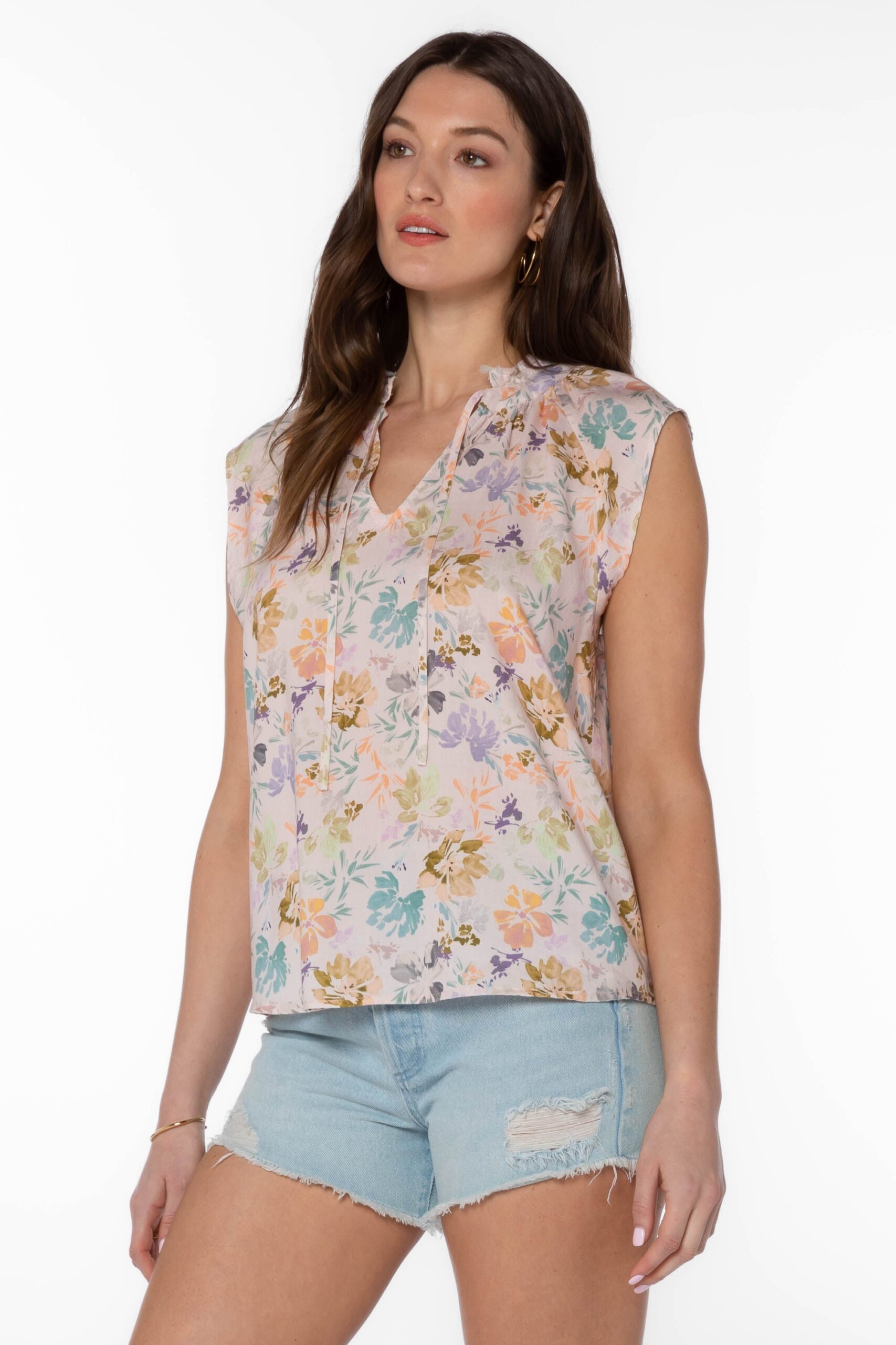 This sleeveless, easy care top will keep you cool and comfortable with its flattering split v-neck soft floral print.